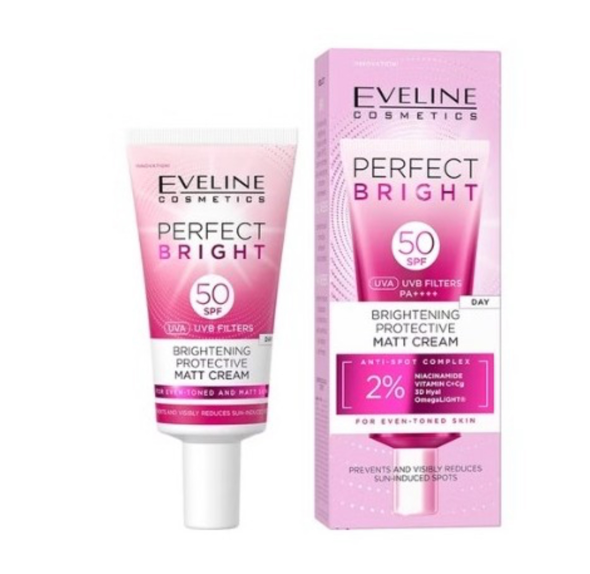Eveline Perfect Bright Rozjaśniająco-Ochronny Matowy Krem do Twarzy SPF50 to zaawansowany kosmetyk, który łączy w sobie intensywną pielęgnację z wysoką ochroną przeciwsłoneczną. Jego formuła została opracowana z myślą o osobach pragnących rozjaśnić przebarwienia, wyrównać koloryt skóry oraz zapewnić matowe wykończenie.