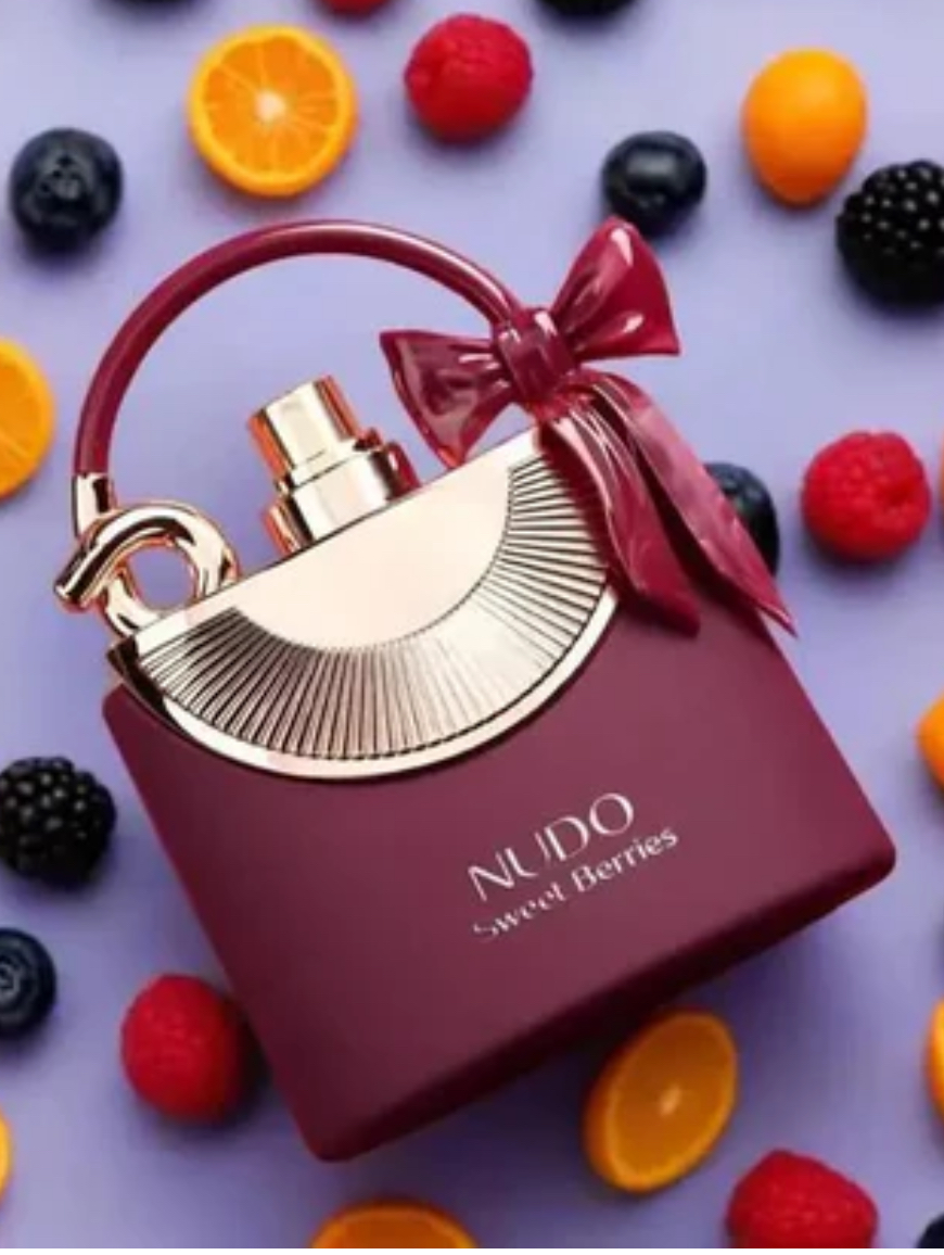 Nudo Sweet Berries marki Fragrance World to kwiatowo – owocowe perfumy dla kobiet. Są to nowe perfumy, Nudo Sweet Berries został wydany w 2024 roku. Nutami głowy są Bergamotka, Pomarańcza, Mandarynka i Grejpfrut; nutami serca są Czarna porzeczka, Malina i Kwiat pomarańczy; nutami bazy są Pianka marshmallow, Ambrette (piżmian właściwy), budyń i Piżmo.