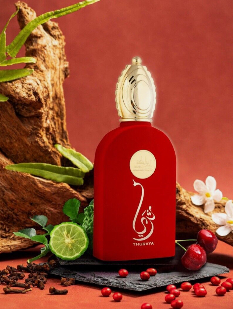 Thuraya marki Lattafa Perfumes to perfumy dla kobiet. Nutami głowy są Wanilia, Nuty drzewne, Czarna herbata i Geranium; nutami serca są Magnolia i Lawenda; nutami bazy są Czerwone jagody, Herbata i Kardamon.